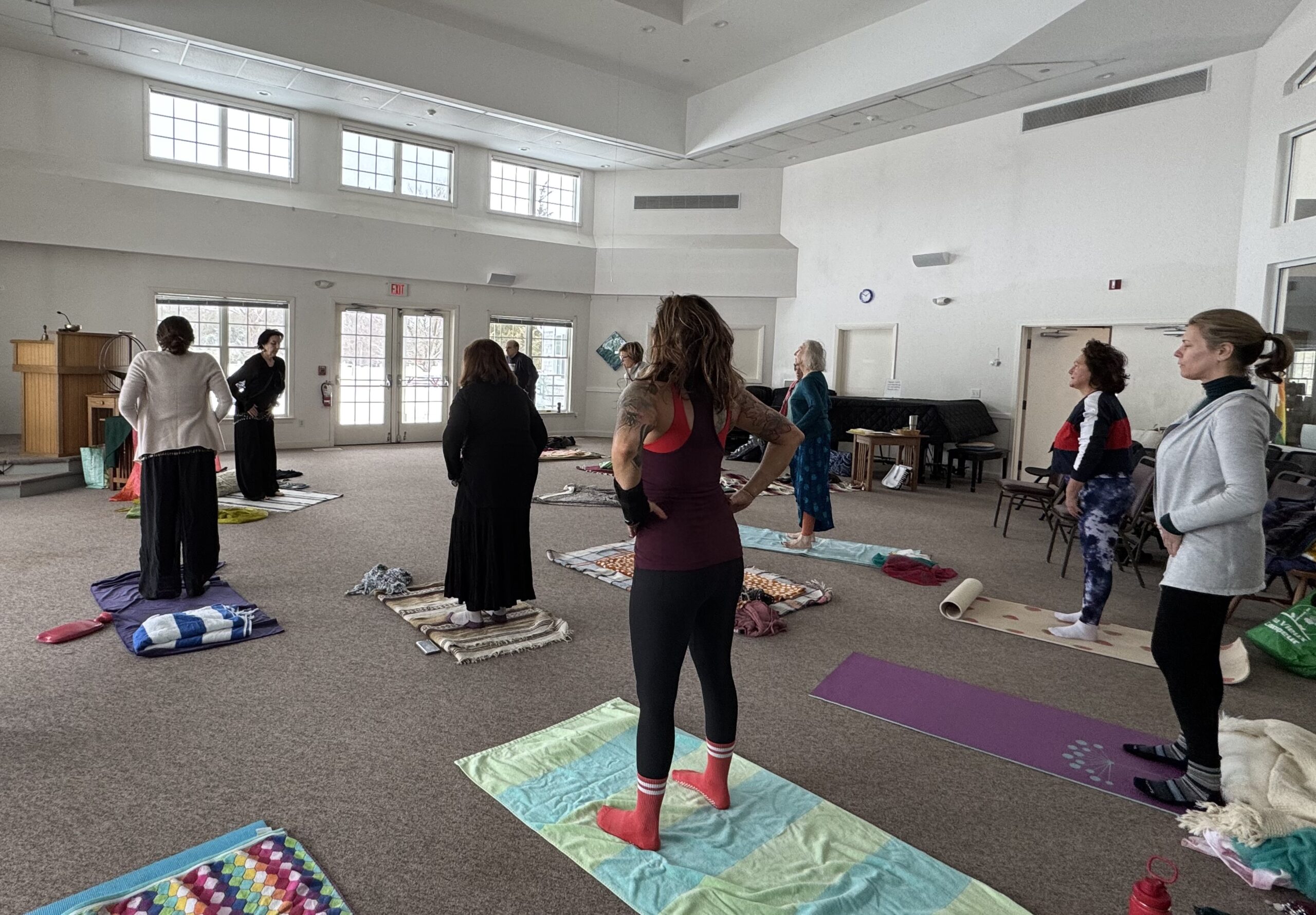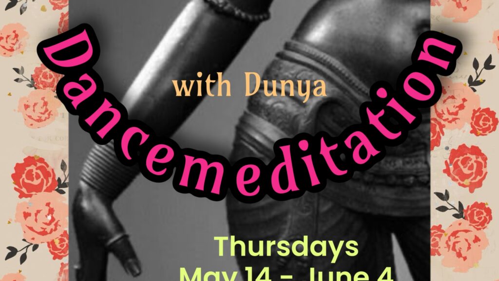 Dunya will guide us in a period of relaxing, wordless instruction to orient our attention into our breathing and spine. Then suggest a simple, rich moving meditations to sink down a couple of notches inside the self, touching Self. There will be a generous, spacious period of time for participants to do their own exploratory intuitive movement, to digest and integrate meditative efforts.