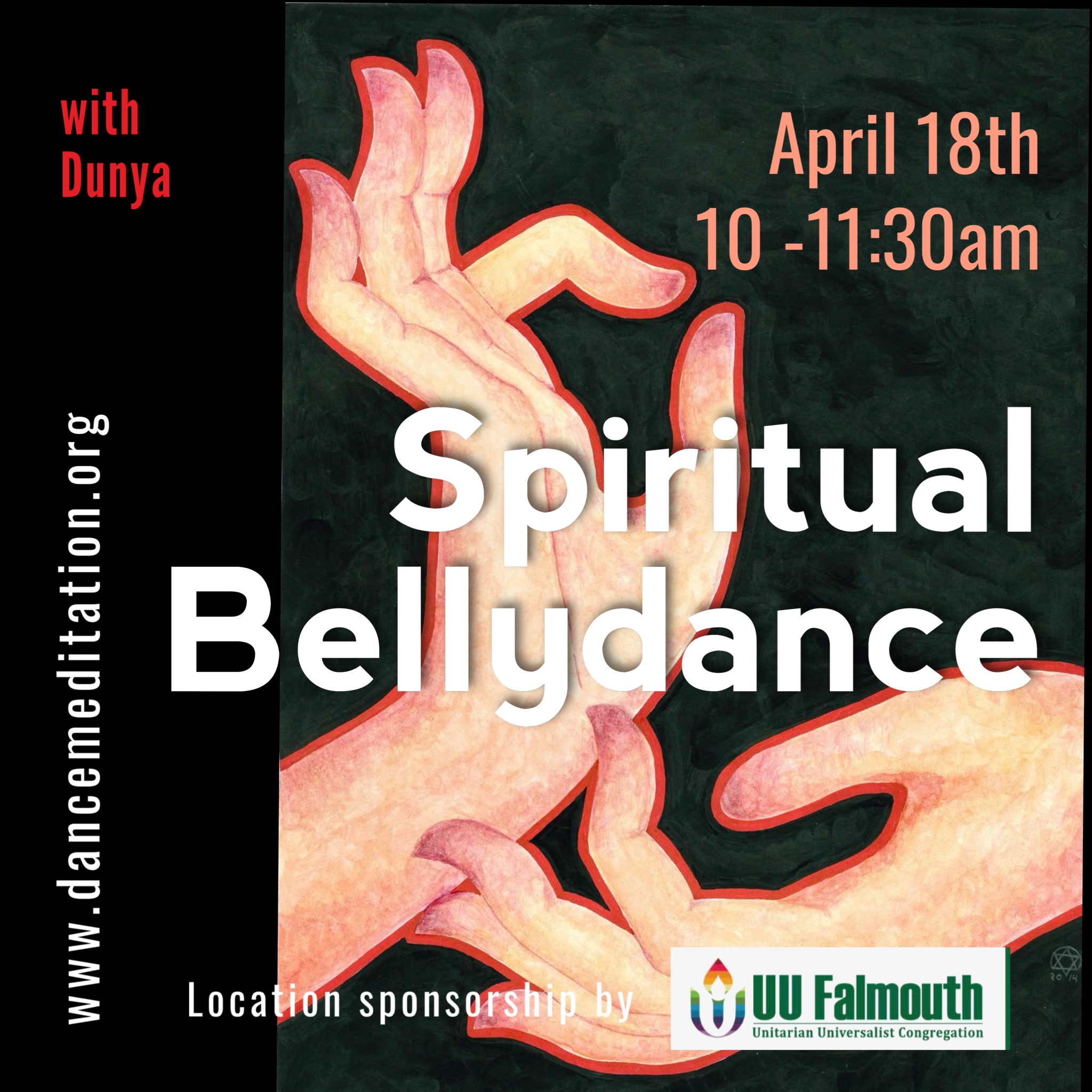 Saturday April 18th, 10 – 11:30am at UU Falmouth, 840 Sandwich Rd, East Falmouth, MA 02536 ~ All are welcome. The monthly Spiritual Bellydance and Sufi Dancemeditation sessions are part of a year-long series. Come be part of our growing community.